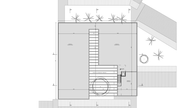 To have a compact volume we proposed the use of vertical lifts instead of ramps, thus preserving a central tree that shapes the void of the entire volume. The choice of a lift also created the conditions to a future development in the top floor, adding a whole new level with the same building footprint. The entire volume is protected from excessive sunlight with a modular ceramic facade, which can be moved with a simple mechanical system to enjoy the elevated vistas to the surroundings.