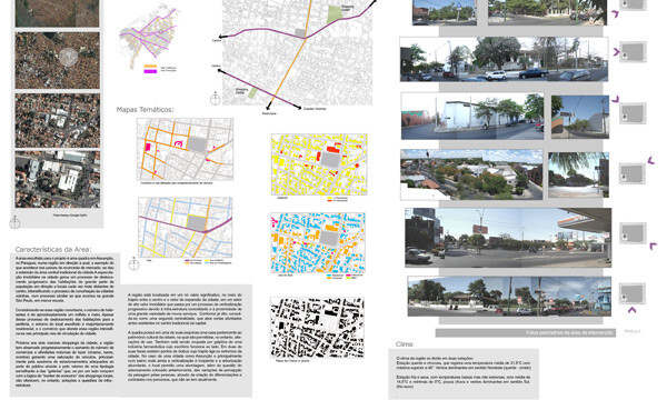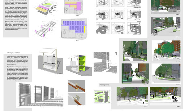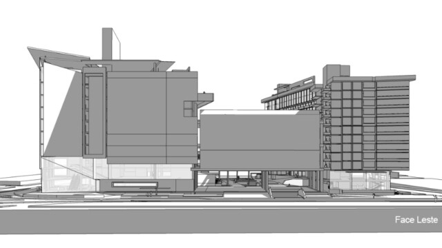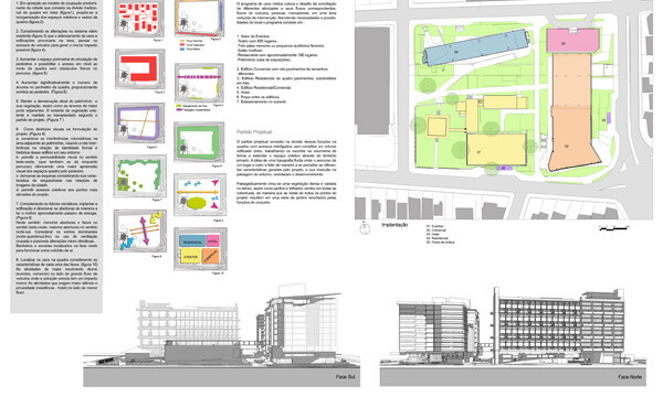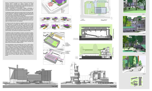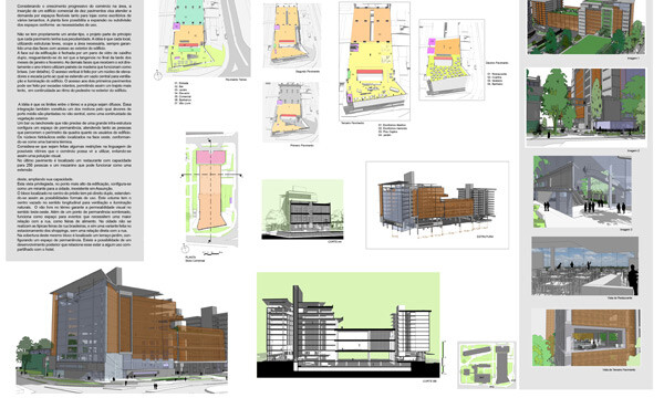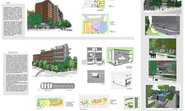 The program chosen: Office and Commerce (22.000 sqm), Theather (4.500 sqm), Hotel (8.000 sqm), Residential (15.000 sqm), Parking (14.000 sqm) in a 2 Ha private property. The square also contained a historic villa that was used as part of the Cultural complex that included the Theater. This preliminary design was part of the final year of undergraduation at the Universidad de Sao Paulo.